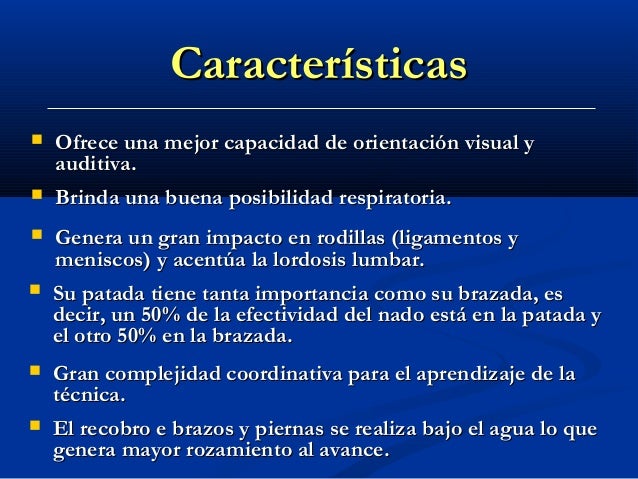 - 3. Características Ofrece una mejor capacidad de orientación visual y auditiva. Brinda una buena posibilidad respiratoria. Genera un gran impacto en rodillas (ligamentos y meniscos) y acentúa la lordosis lumbar. Su patada tiene tanta importancia como su brazada, es decir, un 50% de la efectividad del nado está en la patada y el otro 50% en la brazada. Gran complejidad coordinativa para el aprendizaje de la técnica. El recobro e brazos y piernas se realiza bajo el agua lo que genera mayor rozamiento al avance.